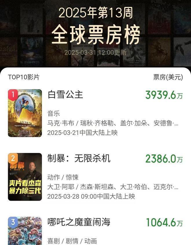 一部口碑很差评分很低,被各人不雅众评为烂片的《白雪公主》,还粗略在上映的第二周,以2亿东说念主民币的上风征服年度超火爆电影《哪吒之魔童闹海》,拿下各人周冠。