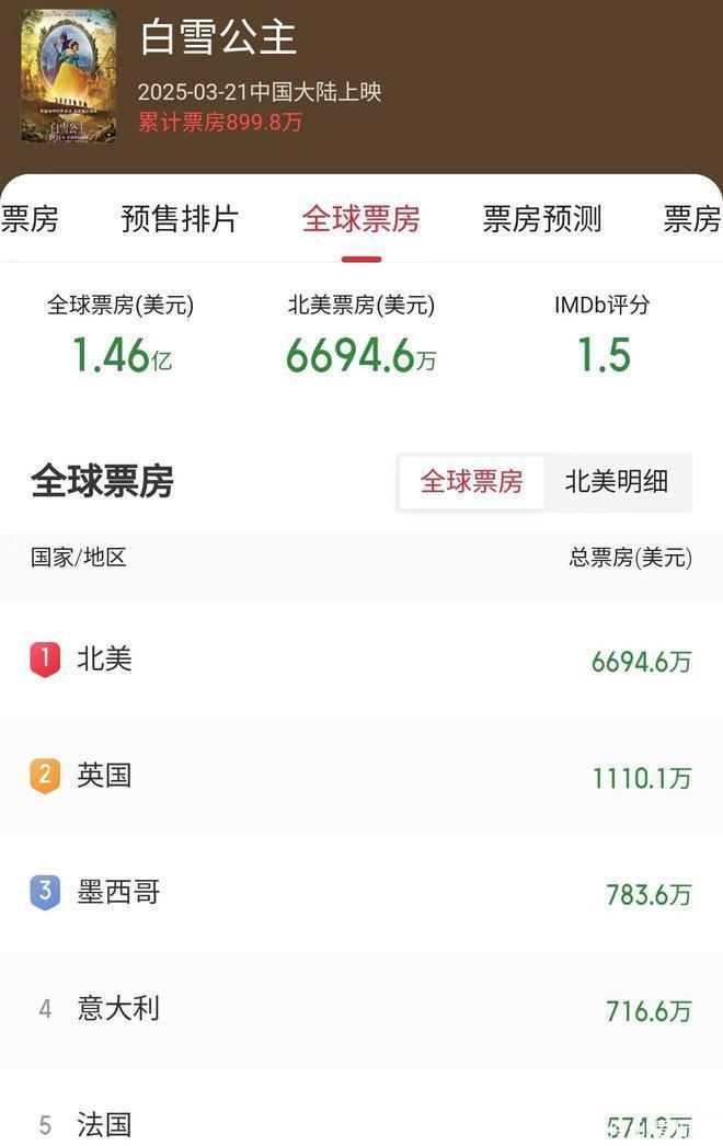 在咱们内地,《白雪公主》的评分就唯有4.0分,是本年度评分最低的电影。因为评分低口碑差,该片的内地票房进展亦然很差,快要半个月的时间累计总票房却还不到1000万东说念主民币。
