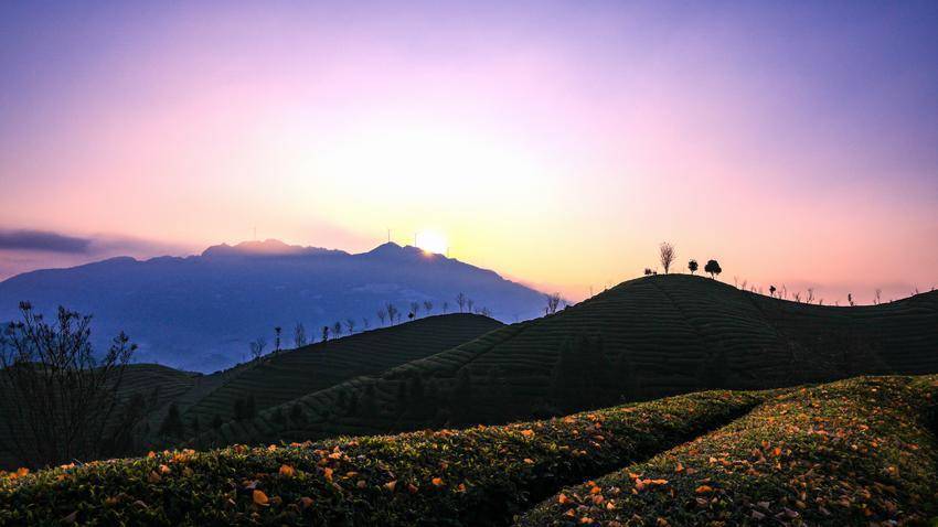 夜色尚未褪尽,圆月仍悬于天幕,清辉洒遍连绵茶园。旋即间,东方泛起鱼肚白,云海翻涌如白絮,将万亩茶垄轻轻托起。