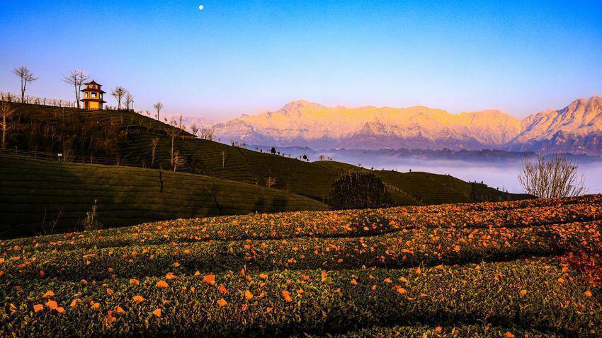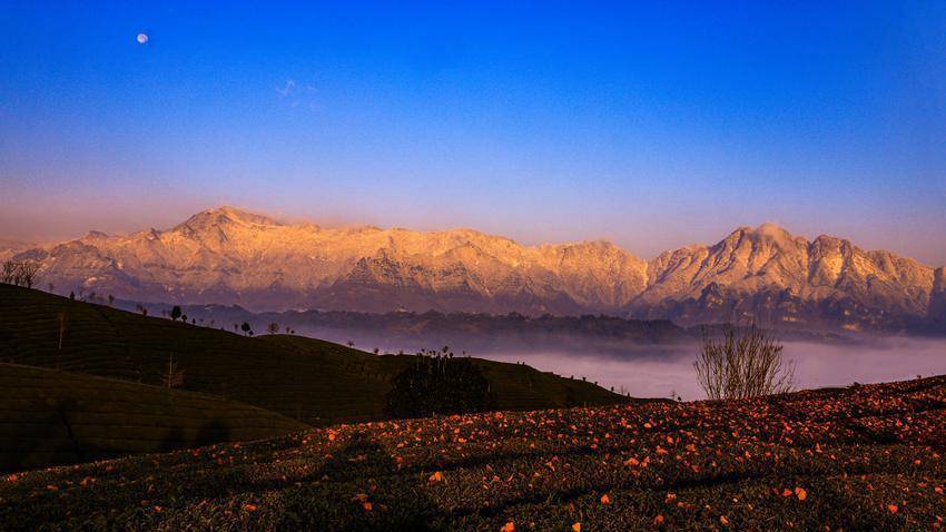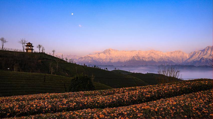 一轮晓日跃出天空,金红霞光泼洒开来,迢遥的雪山被染成秀丽的胭脂色。蓝天清澈如洗,圆月与向阳遥遥相望,清辉与金芒合股,云海腾浪,茶垄凝霜。一幅日月同辉、山海相映的奇景,在鹤峰走马的晨风中慢慢铺展,惊艳了山水,更惊艳了追光东说念主的办法。