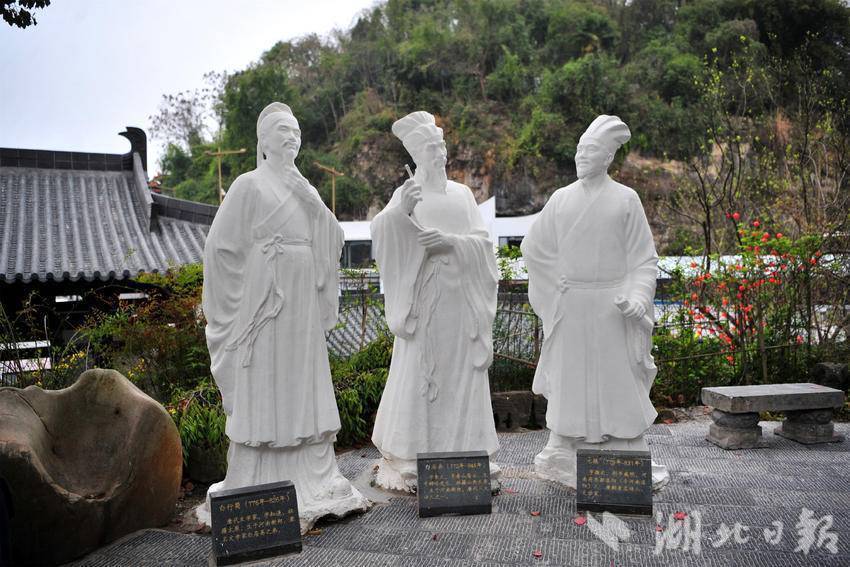 在宜昌市夷陵区三游洞征象区拍摄的唐代体裁家诗东谈主白行简、白居易和元稹的雕像。