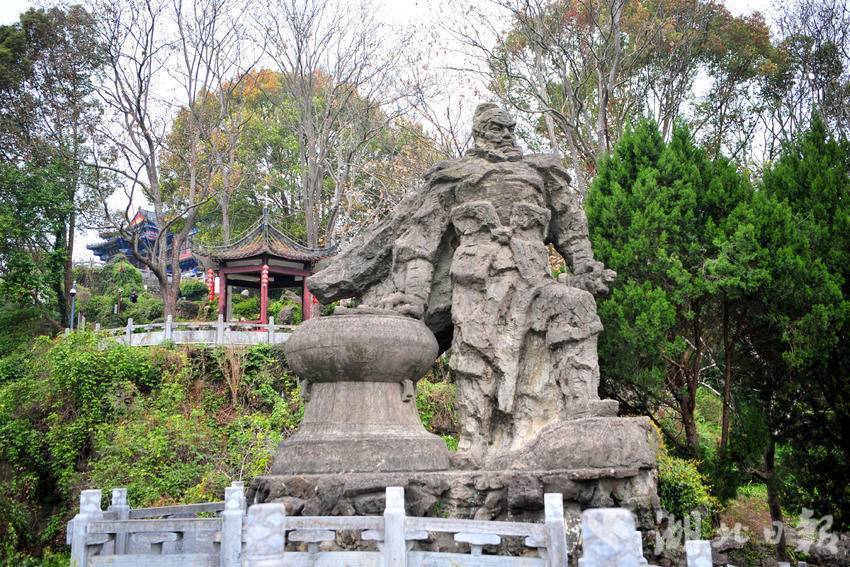 在宜昌市夷陵区三游洞征象区拍摄的张飞擂饱读台雕像。张飞像目视西陵峡口,英武张扬。过去张飞作念宜齐郡守的工夫,在这里操练水军,建台擂饱读巴结。