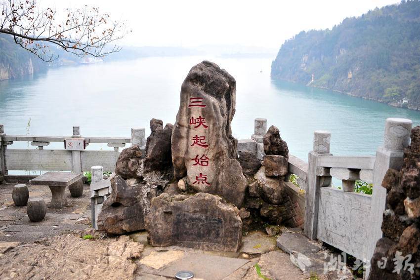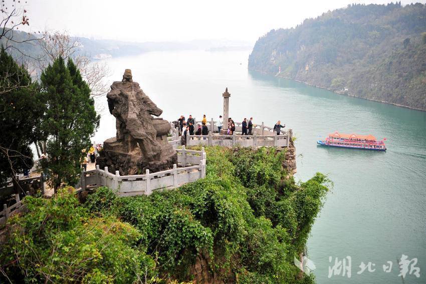 搭客在宜昌市夷陵区三游洞征象区的长江三峡肇端点不雅景平台游览拍照。