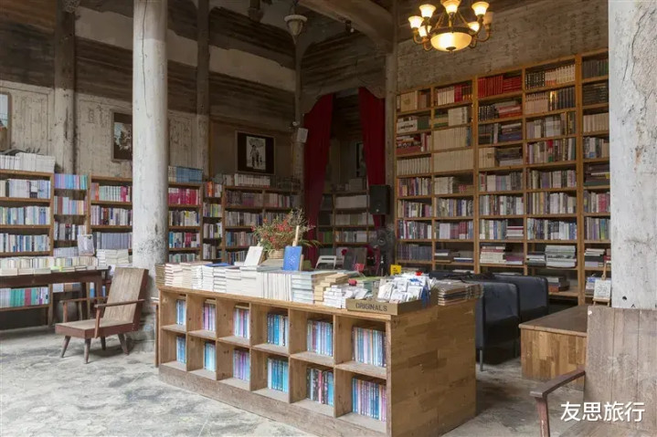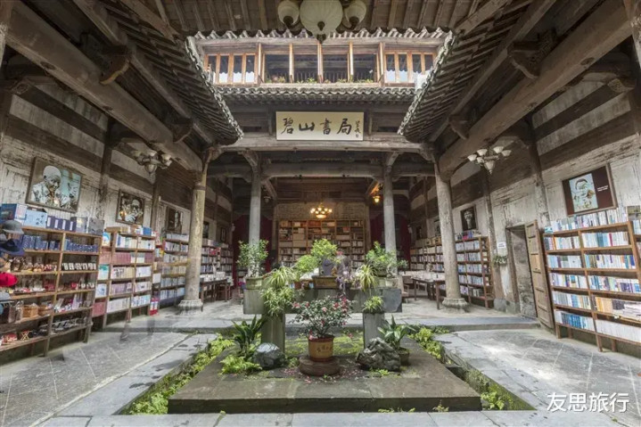 碧山书局保留了徽派栽植传统的木质梁柱和宏大的天井。