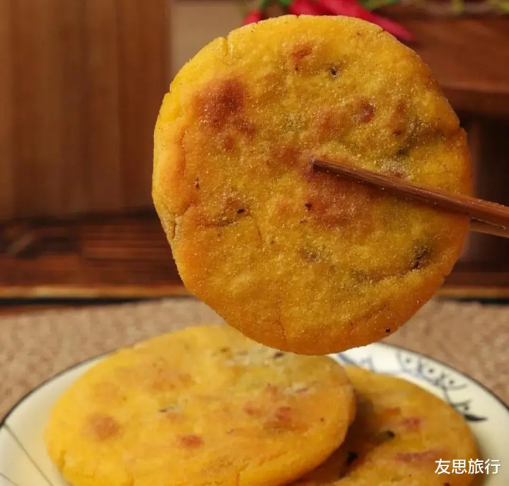 把玉米面熬成糊糊后揉成面团,内部包上梅干菜和肥瘦相间的鲜猪肉,压成扁平的圆饼,在锅里烙熟。