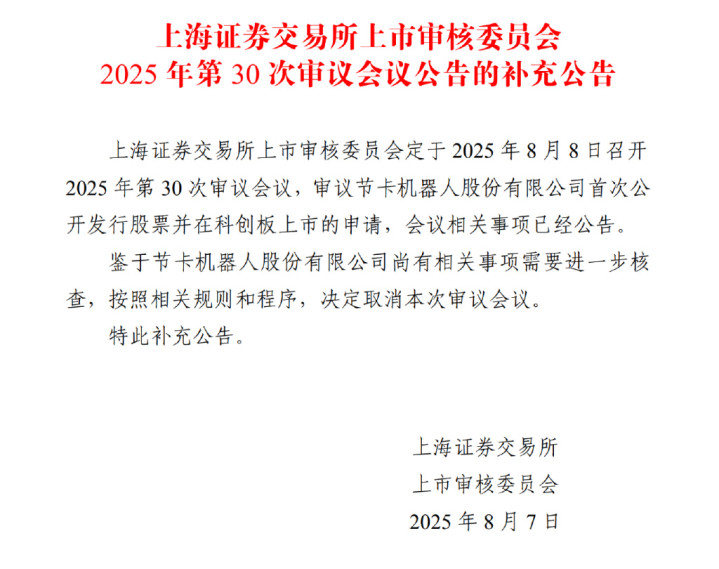 1、把柄上交所的补没收告,上海证券交游所上市审核委员会定于2025年8月8日召开2025年第30次审议会议,审议节卡机器东说念主股份有限公司初度公确立行股票并在科创板上市的请求,会议相关事项照旧公告。鉴于节卡机器东说念主股份有限公司尚有相关事项需要进一步核查,按摄影关规矩和法子,决定取消本次审议会议。