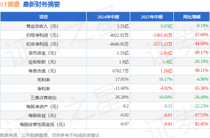 据证券之星公开数据整理,近期ST德豪(002005)发布2025年中报。字据财报显现,ST德豪耗损收窄。终端本讲演期末,公司营业总收入3.07亿元,同比下落8.19%开云体育,归母净利润-1303.45万元,同比高潮67.6%。按单季度数据看,第二季度营业总收入1.57亿元,同比下落13.58%,第二季度归母净利润-1386.01万元,同比高潮43.19%。