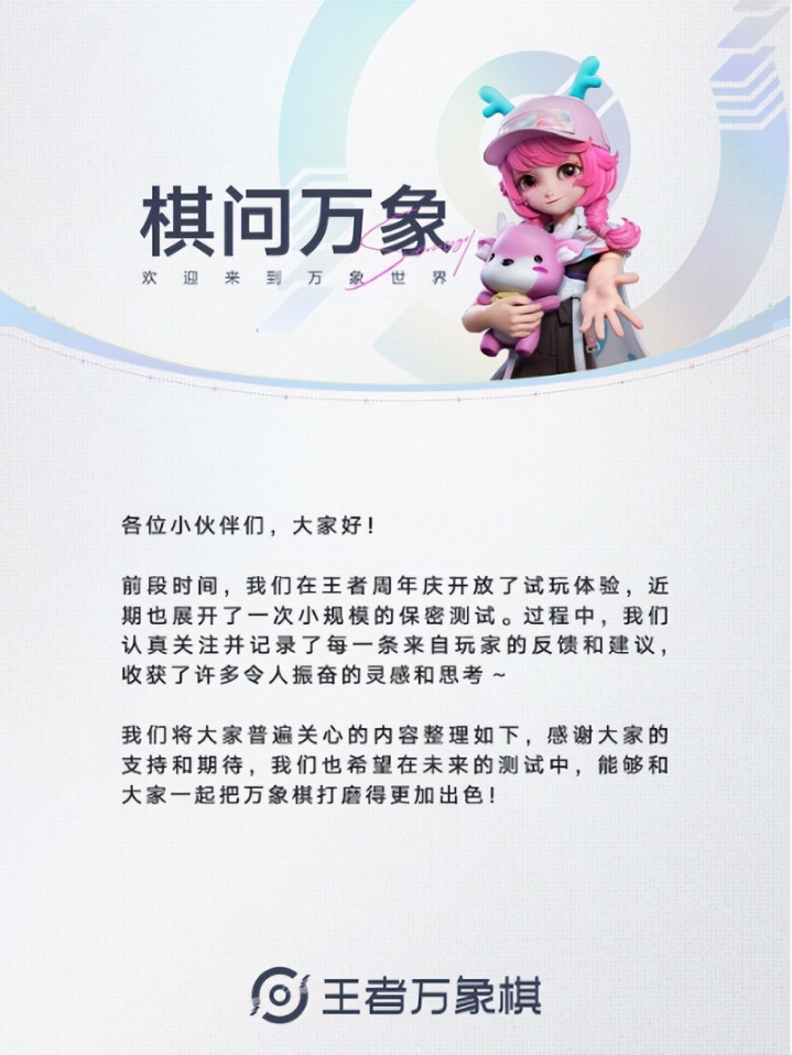 《王者万象棋》的制作主说念主Donny曾示意:“如若有玩家建议被团队遴选,将会在该内容的关联先容中袒露玩家昵称”。神色组充分展现出了深度听取玩家认识、赤诚通达的立场,致力于于将传统的“测试-响应”经由,进化为一个 “及时疏导-敏捷共创” 的体系化运作款式。