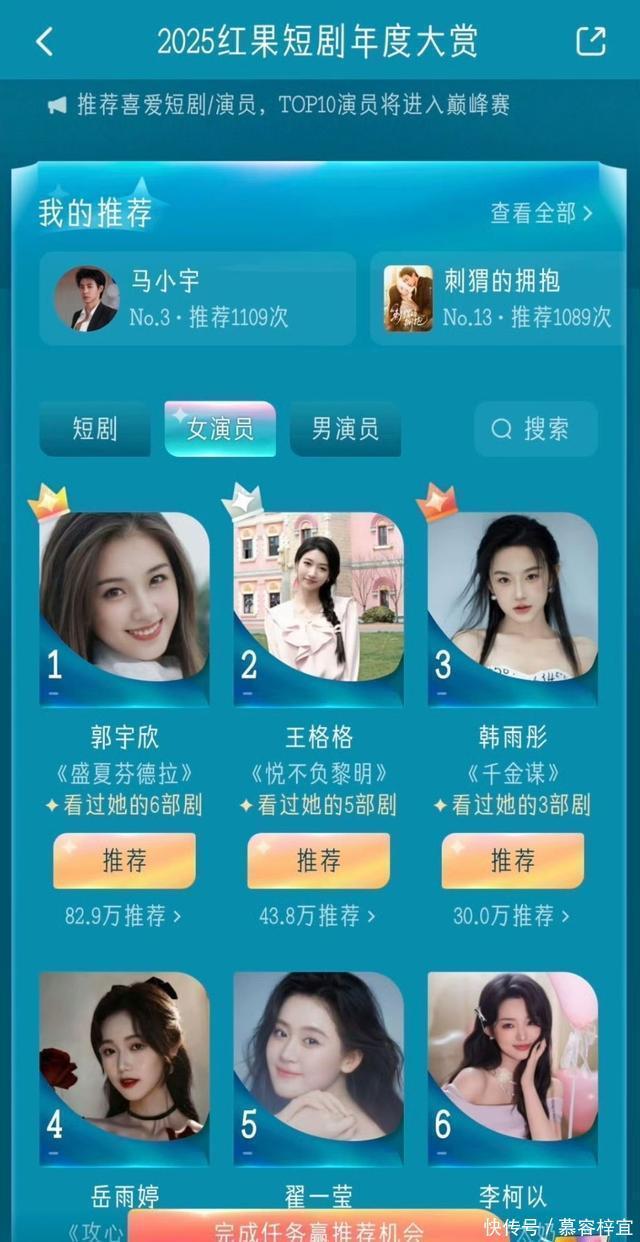 逼迫12月25日,现时榜单表情开云体育,TOP3排行与票数差异如下: ——女演员郭宇欣89.9万断层逾越;王格格47.4万换票+氪金;韩雨彤32.9万。 ——男演员刘萧旭67.8万;马小宇46.5万氪金争议最大;陈添祥45.6万 ——短剧盛夏芬德拉》77万;《攻心为上》45.3万;《令嫒谋》32.2万。
