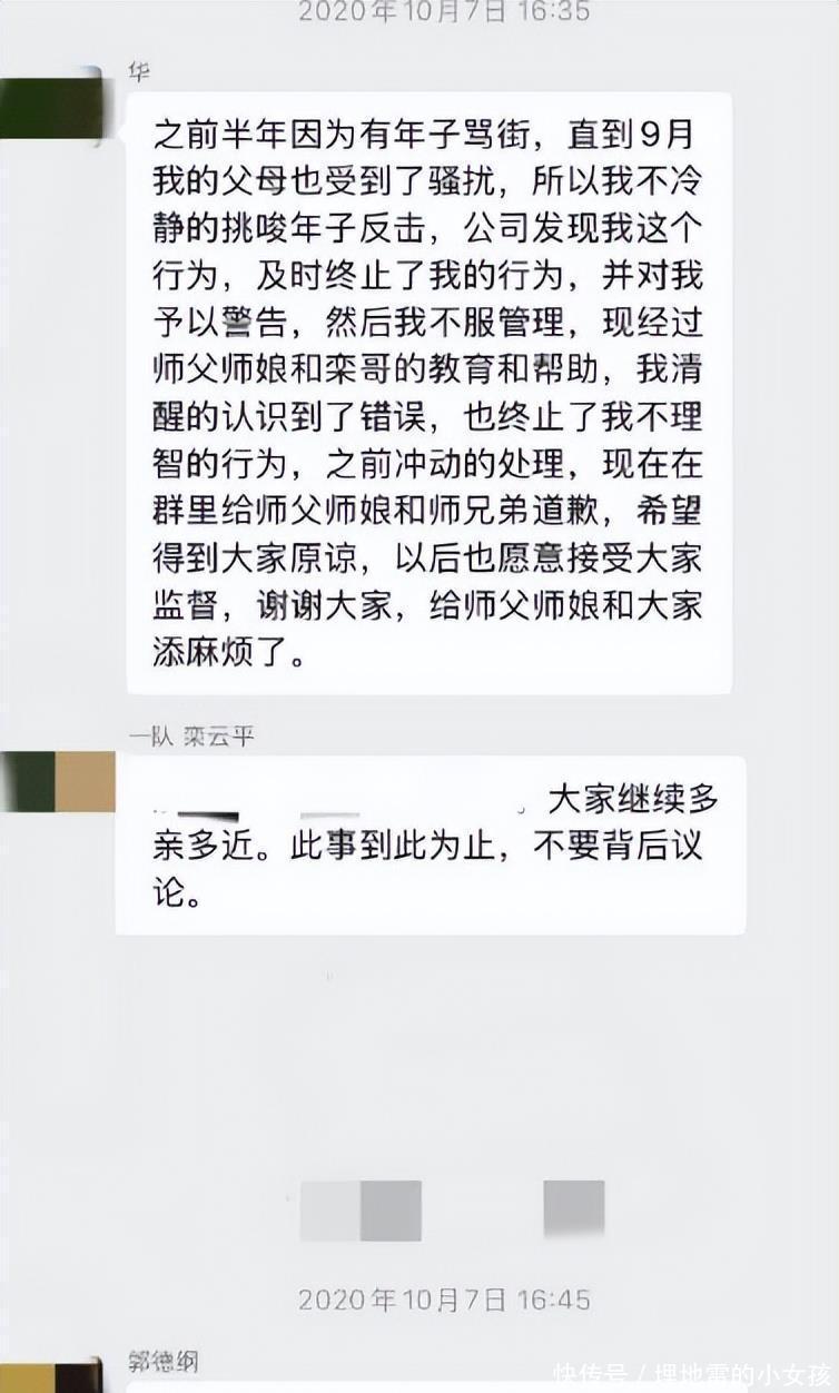 另外,尚九熙还晒出了德云社的群聊纪录。在聊天纪录中,咱们也看到郭德纲对门徒的严厉,“我这不是大车店,念念来就来,念念走就走”。同期,尚九熙也在长文之中,明确默示,何九华挑动粉丝对其网暴等行为。
