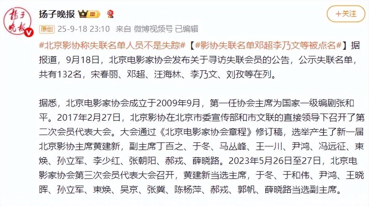 云尔参考:新浪微博|电影刺杀演义家官微扬子晚报|北京影协称失联名单东说念主员不是失散