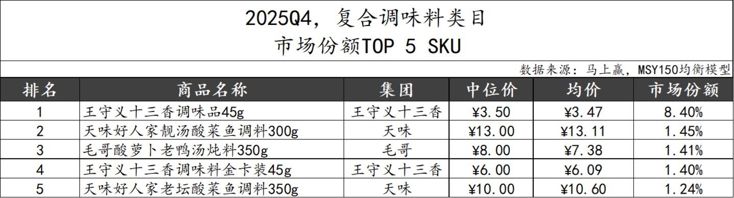 复合调味料类目阛阓份额TOP 5 SKU中,王守义十三香经典家具”十三香调味品“以8.40%的阛阓份额领跑类目,此外还有升级款家具”十三香调味料金卡装“位列第四。天味集团的好东谈主家品牌也有两款酸菜鱼调味料位列第二和第五。四肢非TOP 5集团的毛哥也有一款”酸萝卜老鸭汤炖料“以独到风仪置身第三。