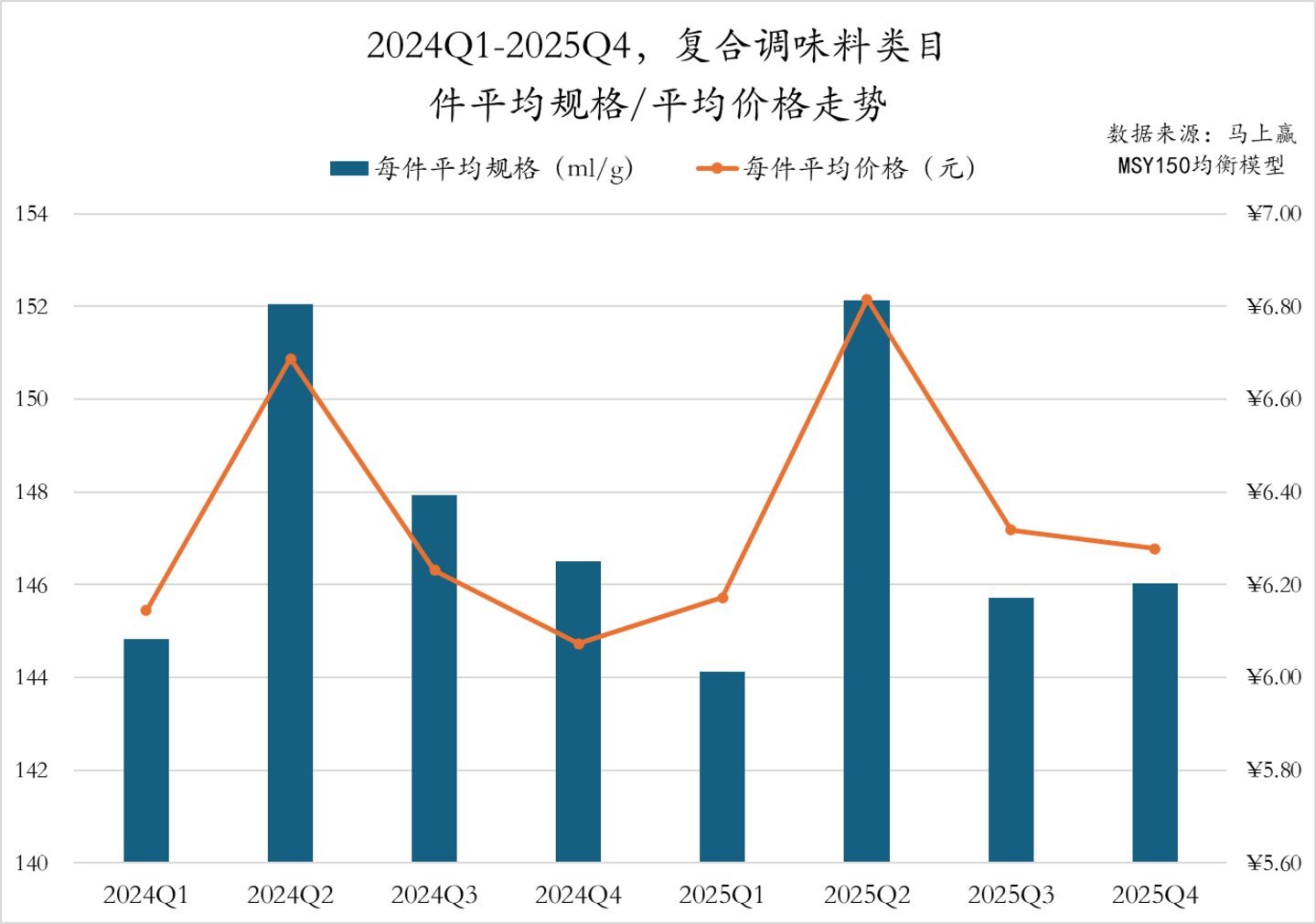 2024Q1至2025Q4,提鲜粉类目件均规格举座呈现增长趋势,其中2025Q4有着较为显耀的波动;比较来说,件均价的波动上升趋势更为赫然,2025年各季度件均价钱均高于2024年同期件均价钱。