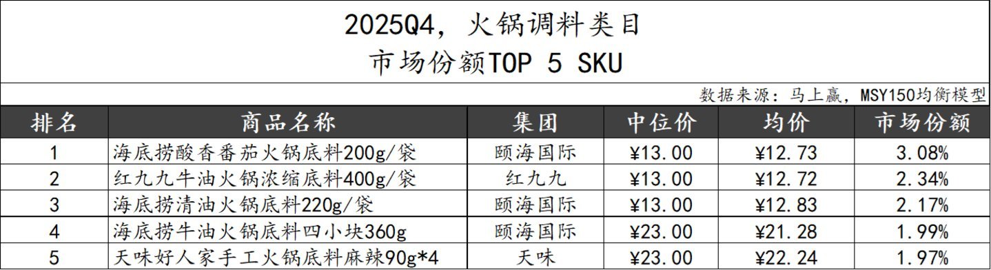 2025Q4,暖锅调料类目TOP 5集团依旧由颐海海外、天味、草原红太阳、桥头和名扬组成,阛阓份额悉数62.26%,阛阓集会度比较上个季度有所提高(2025Q3 TOP5集团阛阓份额悉数59.11%)。从同比变化来看,颐海海外、桥头和名扬阛阓份额同比提高,天味和草原红太阳则同比下滑。