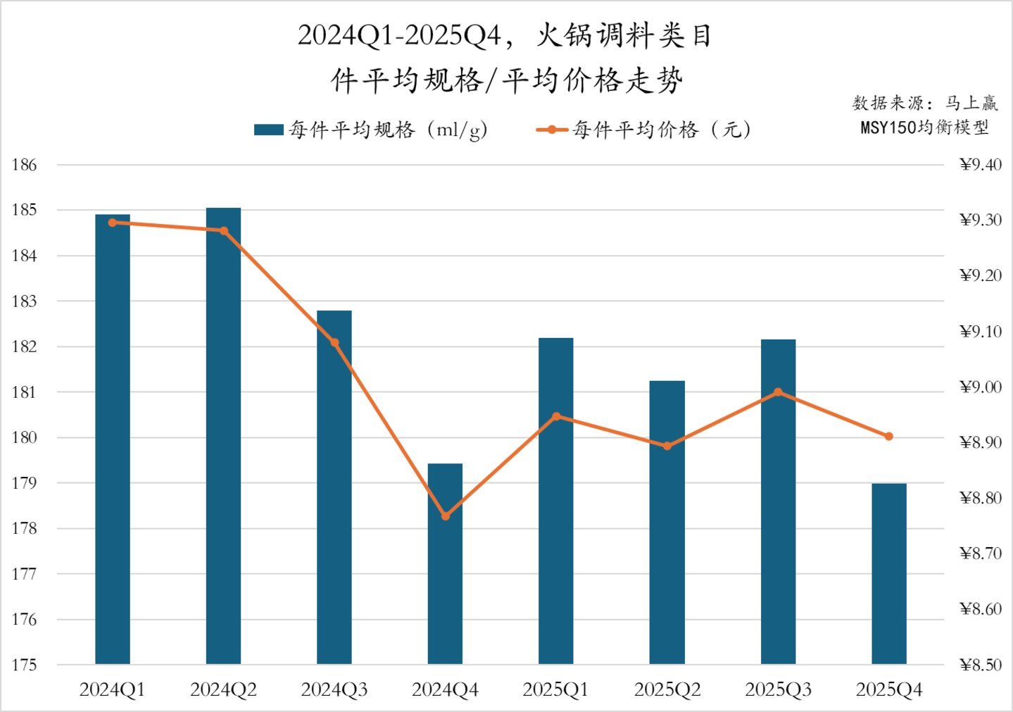 2024Q1至2025Q4技艺,暖锅调料类方针件均规格和件均价走势基本一致。件均规格方面,2024Q2达到高点,随后初始赫然回落,2024Q4降至低点;2025Q1和Q3规格均有回升,但2025年举座水平仍低于2024年同期。件均价方面,2024Q1至Q2价钱保执较高水平,随后举座呈现下行趋势,2025年举座价钱比较2024年同期有所裁汰。举座来看,暖锅调料类目呈现出赫然的规格与价钱“双降”趋势,或是为得当单东谈主份及袖珍聚餐等需求作念出诊疗。