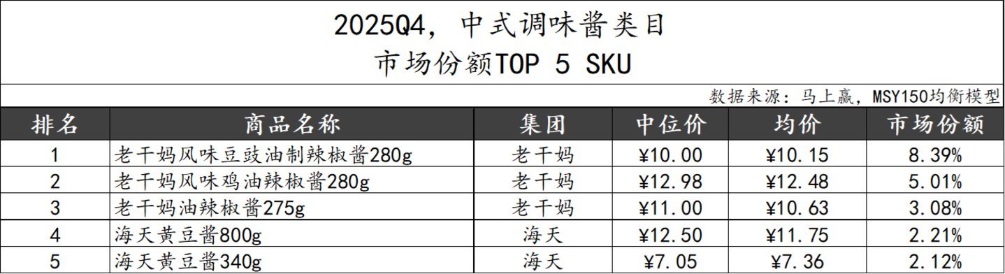 2025Q4,登第调味酱类目阛阓份额TOP 5 SKU中,头部集团经典家具依旧发扬强势。四肢阛阓份额第一的集团,老干妈凭借三款不同风仪的辣椒酱家具占据了前三,海天则凭借两款不同规格黄豆酱家具占据第四、第五。