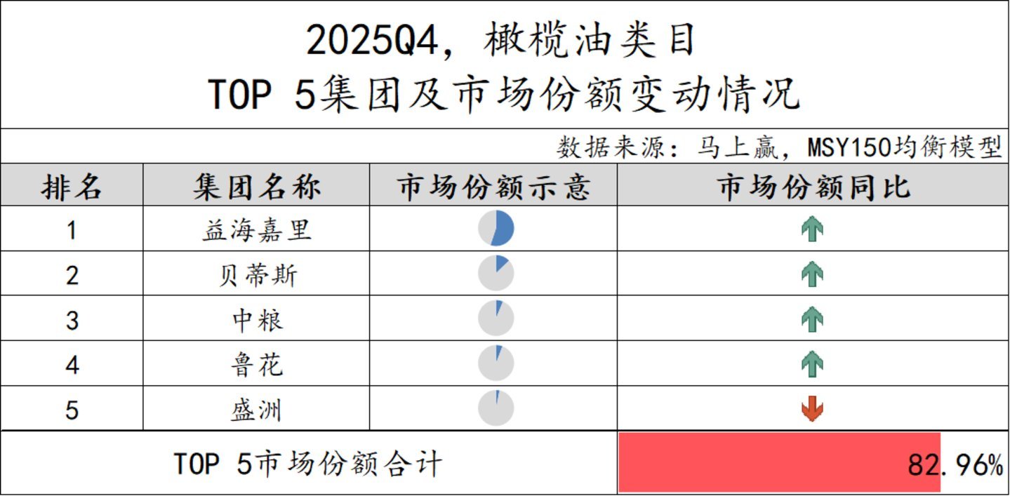 2025Q4,橄榄油类目TOP 5集团为益海嘉里、贝蒂斯、中粮、鲁花和盛洲,阛阓份额悉数82.96%,是调味品阛阓中集会度较高的类目。其中,益海嘉里在占据过半阛阓份额的配景下,阛阓份额依然斥逐同比增长。除盛洲阛阓份额同比有所下滑外,其余集团同比均有所提高,橄榄油类方针集会度也或将进一步提高。