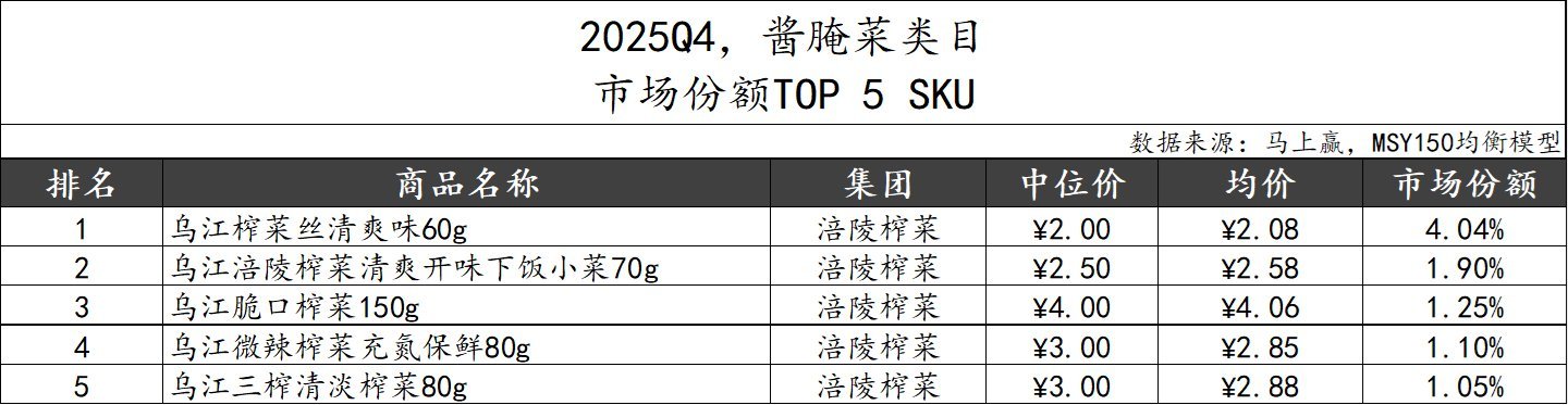 2025Q4,酱腌菜类目阛阓份额TOP 5 SKU中,头部集团涪陵榨菜依旧包揽系数席位,规格从60g-150g不等,包含”深远“、”微辣“、”清淡“等不同口味,得志不同破钞需求。