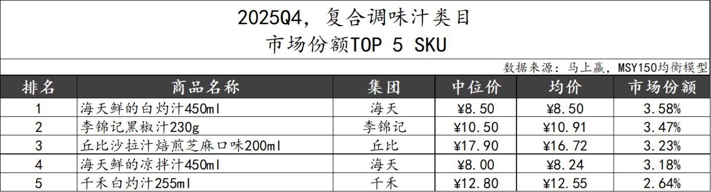 2025Q4,复合调味汁类目阛阓份额TOP 5 SKU包摄海天、李锦记、丘比和千禾四个集团。海天以”白灼汁“和”凉拌汁“位列第一和第四;千禾相同有一款白灼汁以小规格高单价的特质位列第五。丘比以经典中高端家具“沙拉汁焙煎芝麻口味”置身第三;李锦记也有一款”黑椒汁“位列第二,TOP 5 SKU不同的口味对应几种不同的调味汁期骗场景,分歧较大。