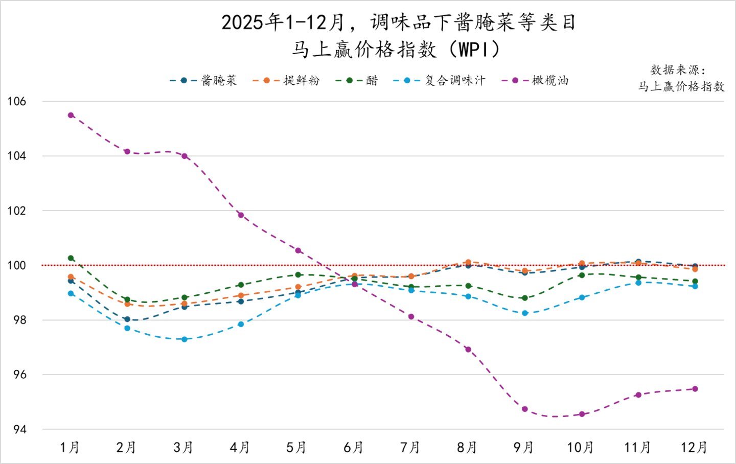 为了更好地分析类目价钱的变动与走势,咱们拉取了2025年全年分月,调味品类目举座及各要点类方针随即赢价钱指数。随即赢价钱指数(WPI)以100为基准值,其数值高下波动为类方针价钱指数与旧年同期价钱指数的相对百分比,100示意与旧年同月执平,高于100示意同比价钱水平上升,低于100则示意同比价钱水平下降。