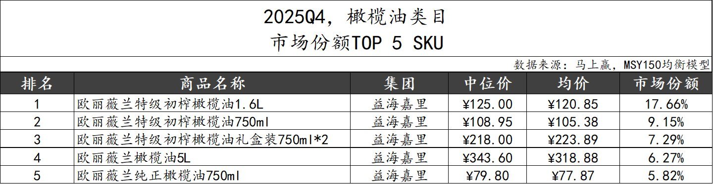 2025Q4橄榄油类目阛阓份额TOP 5 SKU由益海嘉里集团旗下的欧丽薇兰品牌包揽,TOP 5 SKU的阛阓份额悉数就还是接近50%。TOP 5 SKU涵盖了从79-343元/pcs,规格从750ml-5L的各式不同类型的家具,从侧面体现了欧丽薇兰橄榄油系列家具较为熟悉、系统的矩阵和家具布局。