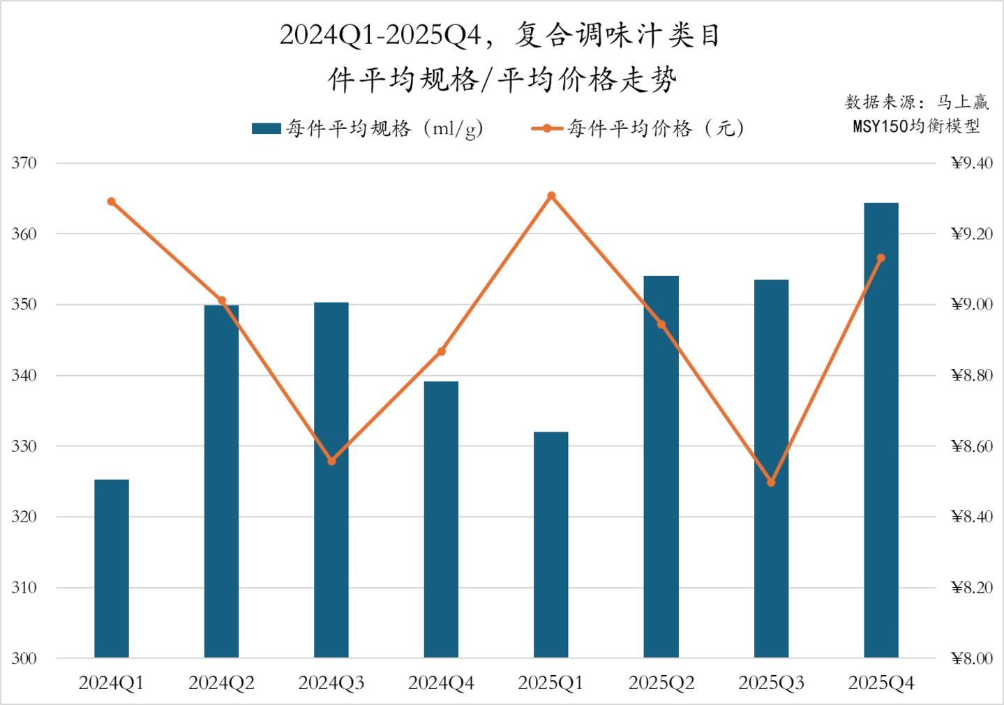 2024Q1至2025Q4,酱油类目件均规格在2024Q4大幅提高至930ml/pcs以上,其余季度在900ml-920ml/pcs之间波动变化。件均价钱方面,2024/2025两年的Q3均为件均价低点,2025年Q1、Q2同比2024年则有着较为显耀的价钱提高,2025Q3、Q4的件均价也均略高于2024年同期。