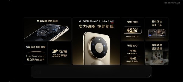 华为Mate80 Pro Max 风驰版还搭载了麒麟9030 Pro贬责器,整机性能比拟华为Mate70 Pro+进步45%。此外,新机还相沿IP68/69级防尘抗水。