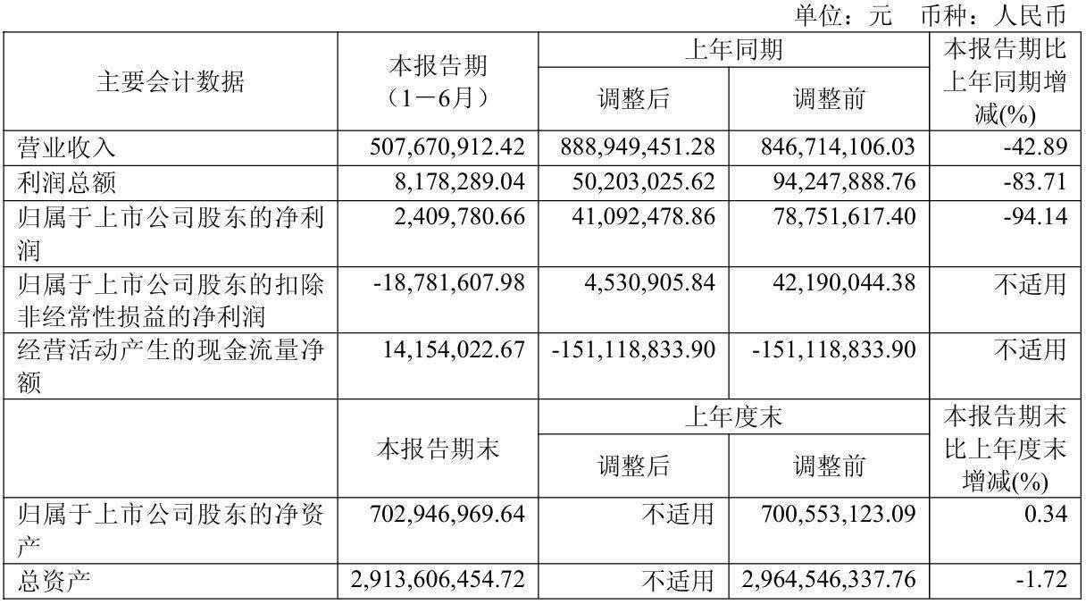 2025年上半年,公司营业收入为5.08亿元,同比下降42.89%;归母净利润为240.98万元,同比下降94.14%;扣非归母净利润为-1878.16万元,同比下降514.52%。