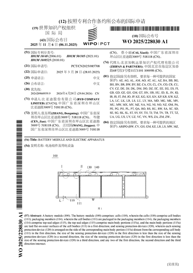 证券之星音讯,把柄企查查数据显现比亚迪(002594)公布了一项外洋专利请求,专利名为“电板组件及用电诱骗”,专利请求号为PCT/CN2025/085708,外洋公布日为2025年11月6日。