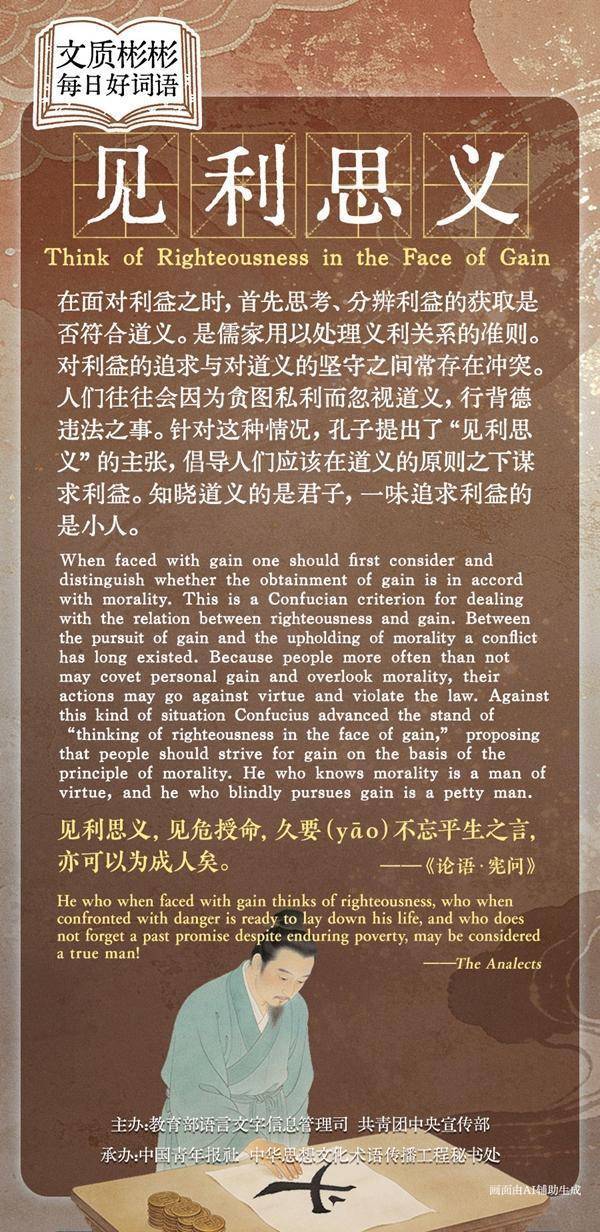 在濒临利益之时,最初念念考、分歧利益的获得是否合乎谈义。这是儒家处置义利相干的准则。对利益的追求与对谈义的遵循之间常存在突破,东谈主们时时会因为贪心私利而淡薄谈义,行背德犯警之事。针对这种情况,孔子提议了“见利念念义”的办法,观念东谈主们应该在谈义的原则之下谋求利益。清楚谈义的是正人,一味追求利益的是庸东谈主。